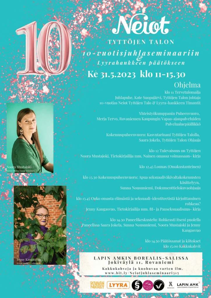 Keskiviikkona 31.5.2023 pidän Rovaniemen Tyttöjen talon 10-vuotisjuhlaseminaarissa alustuksen otsikolla ”Onko omasta elämästä ja seksuaali-identiteetistä kirjoittaminen rohkeaa?” sekä osallistun paneelikeskusteluun, jonka otsikkona on juhlavuoden teeman mukaisesti ”Rohkeasti itseni puolella”.