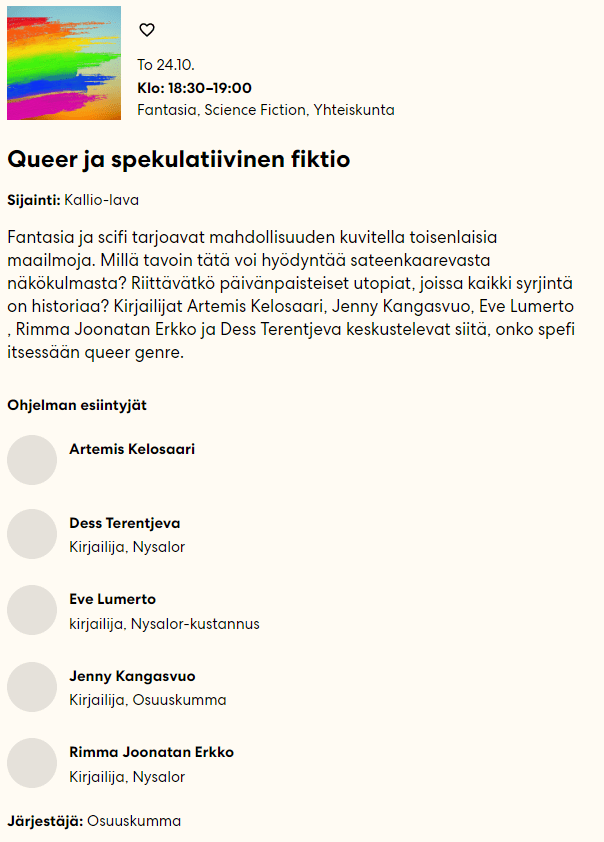 Lisäksi myyn kirjoja Osuuskumman myyntipisteellä ainakin lauantaina 26.10. kello 10:00-12:00. Tervetuloa moikkaamaan, ja tietysti ostamaan kummaa kirjallisuutta!